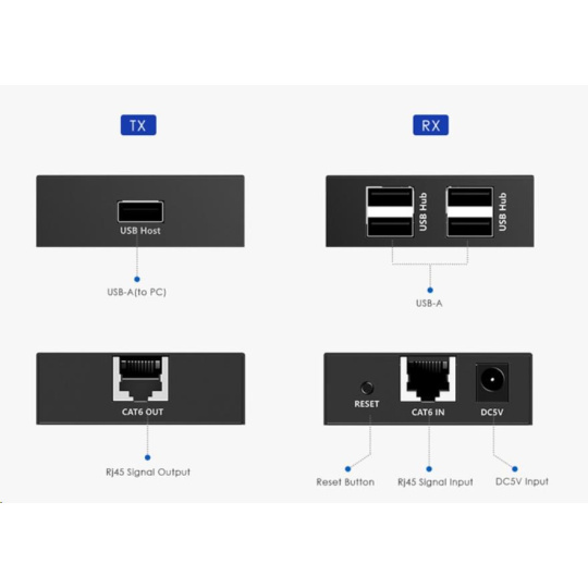 PremiumCord 4-port USB 2.0 extender po Cat5/Cat5e/Cat6 do 150m USB 2.0 extender predstavuje ďalší krok v oblasti predĺženia USB 2.0/1.1 zariadení na vzdialenosť až 150m. Tento extender prekračuje obmedzenie maximálnej vzdialenosti USB 2.0 kábla 5m a umožňuje pripojiť všetky USB periférie až do vzdialenosti až 150m. Pomocou lacného kábla Cat5/Cat5e/Cat6 sa dosiahne ekonomické a efektívne riešenie. Teraz môžete umiestniť vaše kamery, tlačiarne, webové kamery, klávesnice/myši alebo iné USB zariadenia tam, kde to naozaj chcete. - Vysiela USB signál cez Cat5/Cat5e/Cat6 káble až na vzdialenosť 150m. - Skladá sa zo dvoch častí: vysielača a prijímača, ktoré sa navzájom prepoja káblom s konektormi RJ-45 - Nesmie sa zapájať do aktívnej počítačovej siete - ethernetu, s aktívnymi prvkami ako sú switche a routery. - Podporuje zariadenia USB 2.0 a je spätne kompatibilné s USB 1.1 (low-speed, full speed) až do vzdialenosti 150m cez Cat 5/Cat5e/Cat6 káble. - Podporuje pripojenie až 4 USB zariadení na vzdialenej strane extenderu. - Extender používa na prepojenie vysielača a prijímača patch kábel Cat5/Cat5E/Cat6, tento kábel nie je súčasťou balenia. - Na napájanie sa použije priložený power adaptér 230V/5V 1A - Ideálne pre rôzne USB zariadenia ako tlačiarne, webové kamery, pevné disky, mobilné telefóny, iPod, digitálne kamery a herné konzoly. - Riešenie pre spojenie USB na dlhé vzdialenosti - Elegantné riešenie pre natiahnutie dlhého USB kábla medzi niekoľkými miestnosťami - Skutočná dosiahnuteľná rýchlosť prenosu dát cez zariadenie na 150m je až cca 7 MB/s (cca 50 Mbps), otestované Obsah balenia: - 1 x lokálny extender konektory: USB typ A Male, RJ45 Female - 1 x vzdialený extender konektory: 4xUSB typ A Female, RJ45 Female, konektor pre napájanie - 1 x napájací adaptér 5V 1A - 1 x USB prepojovací kábel A/M - A/M Systémové požiadavky: - USB2.0 Port - Windows XP, Windows Vista, Windows 7, Windows 8/8.1, Windows 10