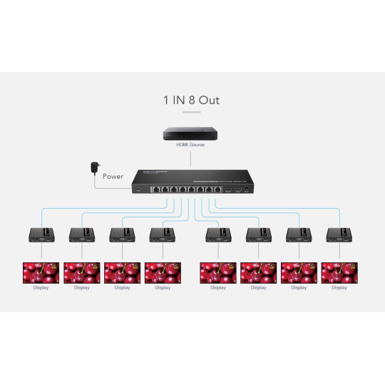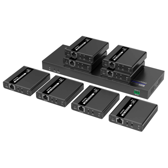 Extender sa skladá z jednej vysielacej jednotky s lokálnym výstupom HDMI a dvoch prijímačov, ktoré sa prepoja káblom CAT6/6a/7 s vysielačom.