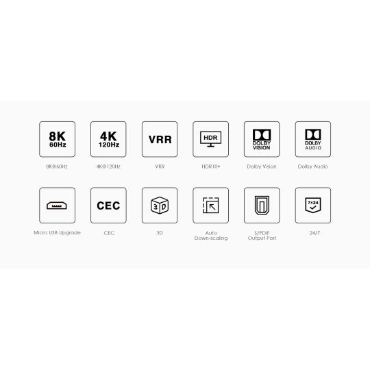 - Rozlíšenie: 8K@60hz, 4K@120Hz, 1080p
