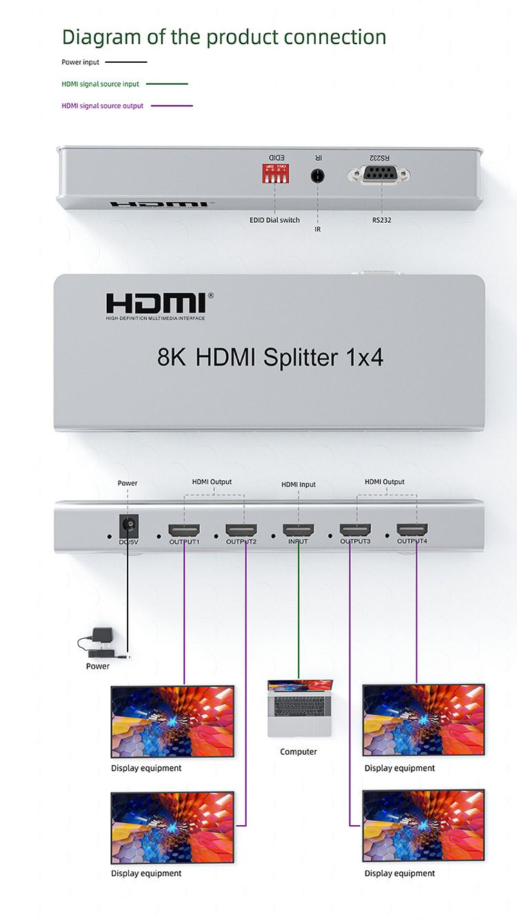 - Prepínač a správa EDID umožňuje pripojiť na výstup rôzne monitory, ktoré podporujú rozlíšenie 8K alebo 4K alebo FULL HD 1080p
