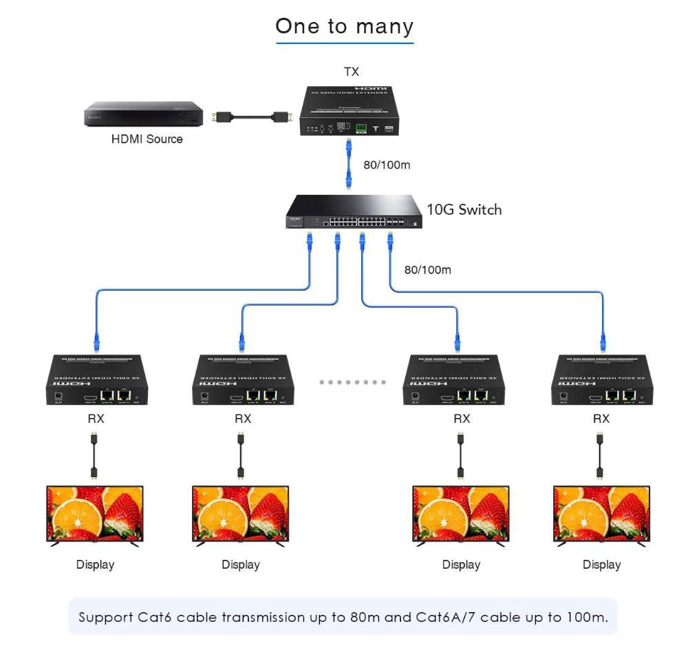 Signál je možné rozdeľovať na viac monitorov pomocou LAN siete, najlepšie 10 Gigabitovej siete a 10 Gigabitových switchov, ako je znázornené na schémach zapojenia. Zapojenie je možné 1:1, do kaskády alebo pomocou 10G switchov jeden na mnoho príjimačov