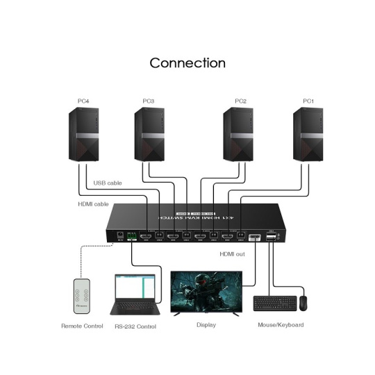 KVM prepínač umožňuje zapojiť až 4 servery alebo PC a ovládať jednoducho pomocou HDMI monitora a USB klávesnice a myši.