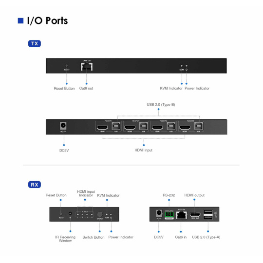- Štyri servery/PC sa pripoja HDMI a USB káblom do prepínača (transmitter).
