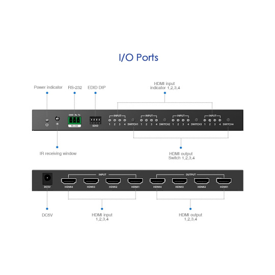 Umožní prepínať a prepojiť štyri zdroje HDMI signálu na 4 HDMI zobrazovače, monitory.