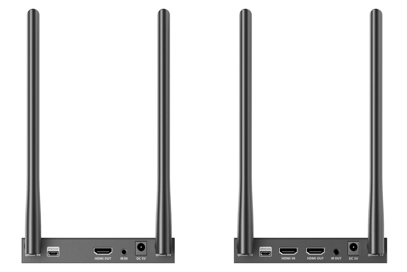- Konektory na prijímači: výstupný HDMI konektor pre vzdialený monitor a konektor pre IR ovládanie (kábel s IR čidlom je pribalený)
