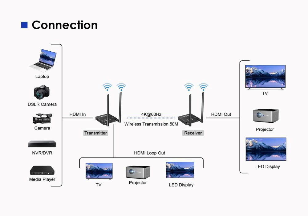 - Podporuje bezdrôtový prenos rozlíšenia 4K@60Hz a Full HD 1080p na vzdialenosť až 50m