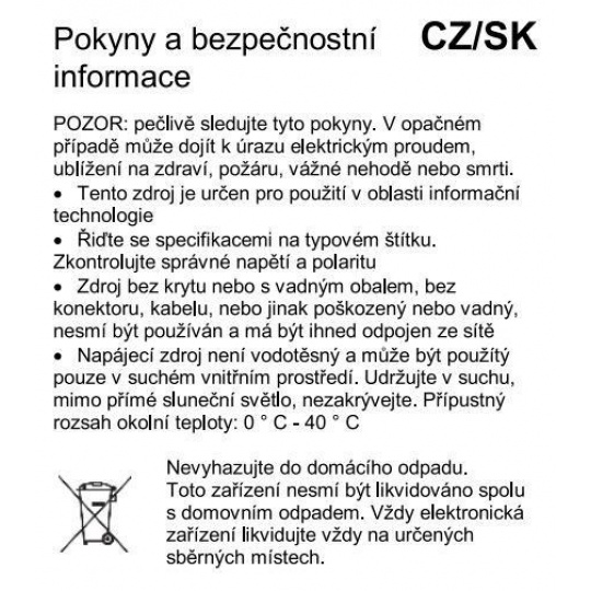 - vstupné napätie 100-240 V/50 Hz AC, sieťová vidlica