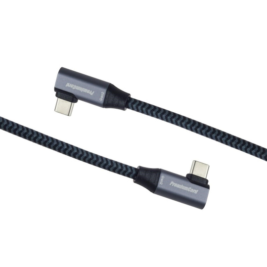 PremiumCord USB-C 2x zahnutý 90° kábel ( USB 3.2 GEN 2x2, 5A, 100W, 20Gbit/s ) hliníkové kryty konektorov, bavlnené opletenie, 1m