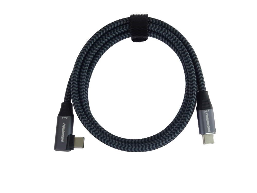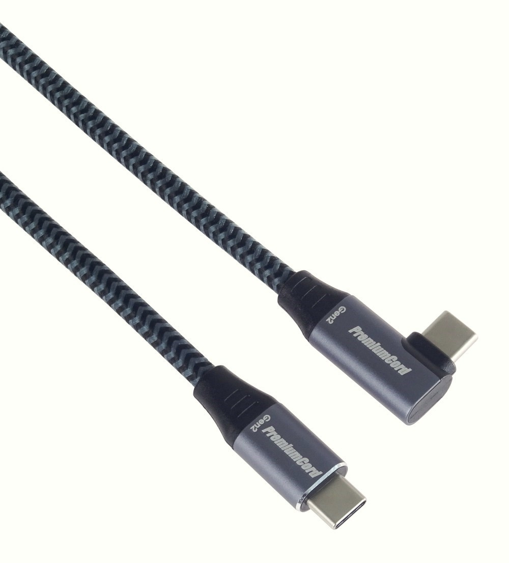PremiumCord USB-C zahnutý 90° kábel ( USB 3.2 GEN 2x2, 5A, 100W, 20Gbit/s ) hliníkové krytky konektorov, bavlnené opletenie, 3m