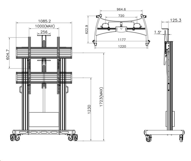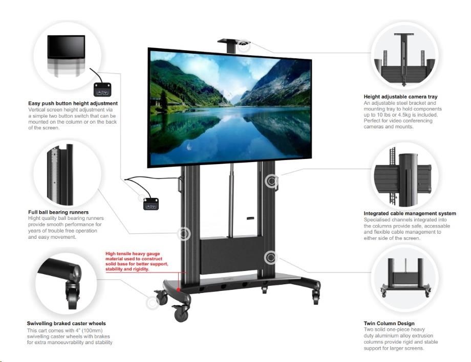 Technické údaje: •nosnost 50kg •VESA standart držáku na Tv 100x100 až 740x460 •nastavitelná výška televize 130cm až 195cm (výška po střed Tv) •náklon obrazovky nahoru až 6,5° a dole až 12° •možnost zakoupení police na příslušenství •možnost zakoupení přihrádek na katalogy •systém vedení kabeláže tělem nosníku •kvalitní pojezdová kolečka s brzdou (možnost zakoupení nepojízdné verze bez koleček) •výborná stabilita a bezpečnost •certifikát TUV GS •záruka 10 let.