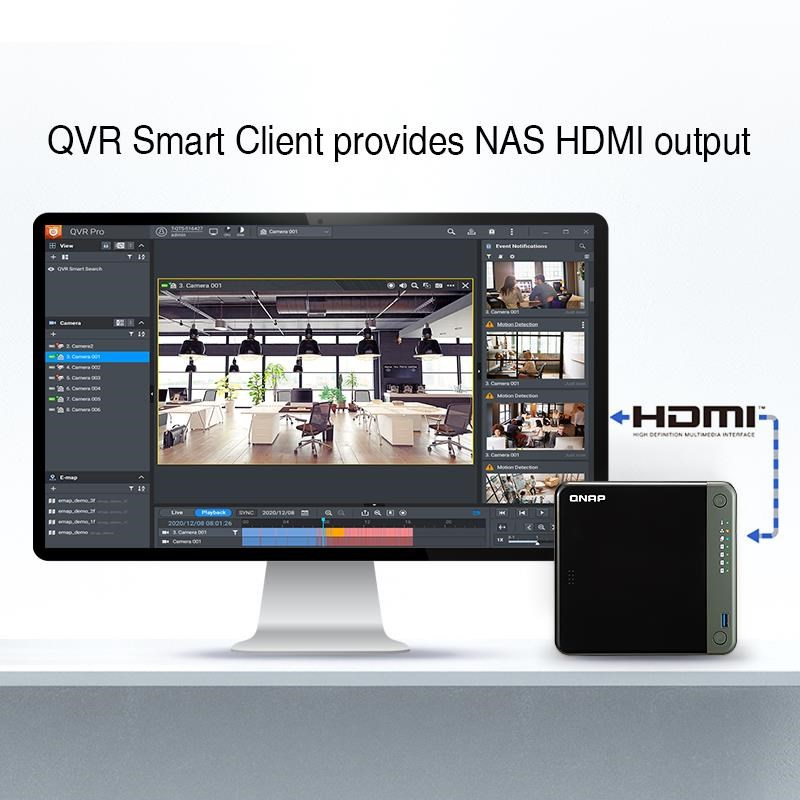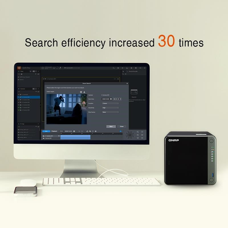licencia QVR AI Pack vášmu NAS poskytuje QVR Smart Search (vyhľadávanie videí) a QVR Smart Client (výstup HDMI). Záznamy udalostí môžete vyhľadávať v časovom období a detekčnej oblasti určeným v rozhraní QVR Smart Client alebo QVR Pro Client. Miesto ručného vyhľadávania v udalostiach videí za celý deň vám QVR Smart Search pomáha efektívne a presne prehľadávať stovky hodín videozáznamov zo stoviek kamier a nájsť konkrétne udalosti. QVR Smart Search Vyhľadávanie videí na báze AI v QVR Smart Search môže bežať priamo na dohľadovom serveri bez ovplyvnenia výkonu systému. Je vybavené detekciou pohybu na videozáznamoch dotazovaním v rámci konkrétneho času, oblasti a citlivosti. QVR Smart Client QVR Smart Client umožňuje používateľom NAS s výstupom HDMI priamo sledovať dohľadové záznamy pripojením NAS k displeju HDMI. Nie sú potrebné žiadne samostatné počítače. Môžete tiež použiť Smart Search v QVR Smart Client a jednoducho zobraziť výsledky hľadania na časovej osi.