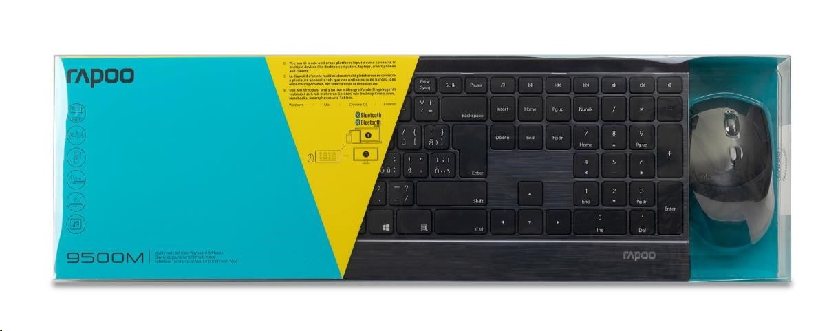 Táto ultratenká súprava myši a klávesnice ponúka prvotriedne materiály so štýlovým dizajnom a pohodlným používaním. Telo klávesnice vyrobené z nehrdzavejúcej ocele a zliatiny hliníka je nielen pevné a odolné, ale dodáva stolu aj určitý štýl. Model 9500M je nielen dizajnovo, ale aj funkčne pokročilý. Ponúka technológiu viacrežimového pripojenia Rapoo - prostredníctvom spoľahlivého 2,4 GHz bezdrôtového vysielača, Bluetooth 3.0 a 4.1 - umožňuje súčasné pripojenie a prepínanie viacerých zariadení (s automatickým párovaním). Myš v tejto súprave je vybavená plne nastaviteľným vysoko výkonným optickým senzorom s rozlíšením 600 až 1600 DPI. Okrem toho technológia úspory energie od spoločnosti Rapoo zaručuje životnosť batérie až 12 mesiacov, čím sa minimalizuje potreba jej výmeny.