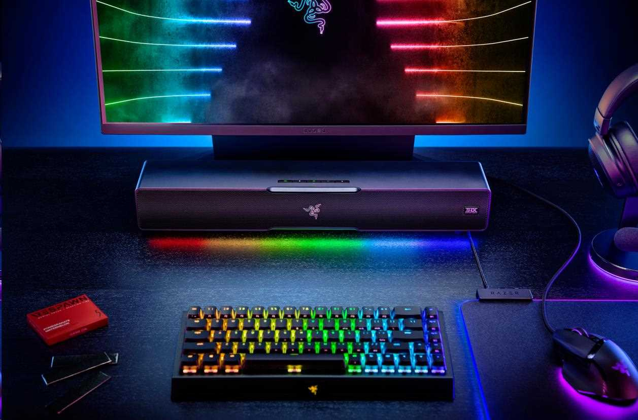 | OTHERS | Razer Chroma™ RGB (18 zones) THX Spatial Audio (PC based via Synapse 3) Bluetooth 5.2 (60ms low latency) USB audio input Razer Audio app Razer Chroma RGB app Custom 10-band EQ Raised feet on soundbar Headphone quick toggle Dimensions: Soundbar: 19.7 x 3.6 x 3.3" / 500 x 91.3 x 84 mm Subwoofer: 8.67 x 8.67 x 9.5" / 220 x 220 x 241.5 mm |