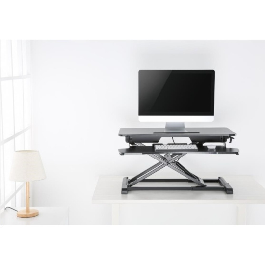 ERGOnomická pracovná plocha na laptop / monitor max 15kg a klávesnicu max 2kg s X mechanizmom so vzduchovým piestom pre zmenu výšky 10,6-50cm na stole, riešenie zmeny polohy zo sedenia na státie bez nutnosti úpravy káblov, rozmery 95x61,5x50 cm + plocha 94,5x30cm, farba čierna.
