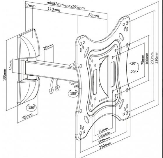Nástenný držiak pre LCD monitory a televízory s uhlopriečkou 23"- 42" (58-107 cm) a maximálnou hmotnosťou 20 kg. 2x záves, vertikálne výklopný +20°/-20° a horizontálne otočný +90°/-90°, vzdialenosť od steny 82-195 mm, materiál oceľ, farba čierna. Montáž VESA: 75x75, 100x100, 100x200, 200x200...