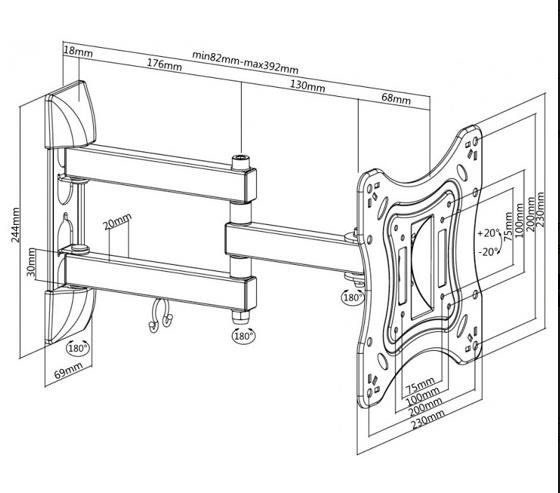 Nástenný držiak pre LCD monitory a televízory s uhlopriečkou 23"- 42" (58-107 cm) a maximálnou hmotnosťou 20 kg. 3x záves, vertikálne výklopný +20°/-20° a horizontálne otočný +90°/-90°, vzdialenosť od steny 82-392 mm, materiál oceľ, farba čierna. Montáž VESA: 75x75, 100x100, 100x200, 200x200...