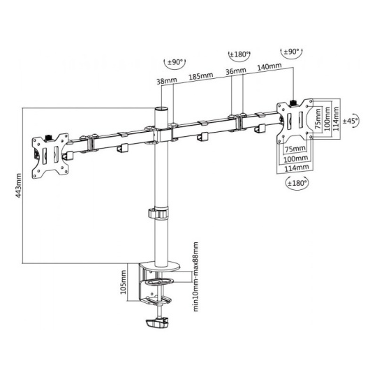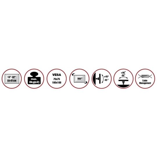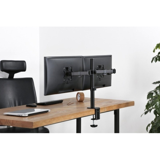 Stolový držiak s upevňovacou svorkou pre 2x LCD monitor s uhlopriečkou 13"- 32" a hmotnosťou najviac 8kg na rameno. 2x 39,9cm rameno - 3x pánt, vertikálne výklopný +45°/-45° a horizontálne +90°/-90°, otáčanie monitorov o 90°, výška stredového stĺpika 44,3cm. Uchytenie VESA: 75x75, 100x100. Možnosť uchytenia káblov.