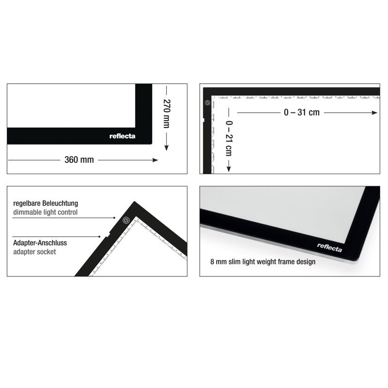 Prosvetľovací panel s UltraSlim LED technológiou, prosvetľovacia plocha 31x21cm s mierkou v cm, plynulá regulácia výkonu, 3000/ 5000/ 8000K, CRI vyšší ako 90, dotykové ovládanie, sieťový zdroj 5V/2A/10W - micro USB, životnosť LED 50.000h. Rozmery 37,1x27,8x0,8cm, hmotnosť 640g.