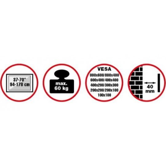 Cenově výhodný nástěnný ocelový držák SLIM s minimální vzdáleností od stěny na Plasma a LCD TV s uhlopříčkou 37"- 70" (94-178cm) a hmotností maximálně 60kg. Bez konzole (pouze úchyty) na zavěšení TV s upevněnými držáky - protikusy, dolní distanční prvky. Není vertikálně výklopný, vzdálenost od stěny 40mm, materiál ocel, barva černá. Uchycení VESA: 100x100, 100x200, 200x200, 400x200, 400x400, 600x400, 600x600, 800x600..