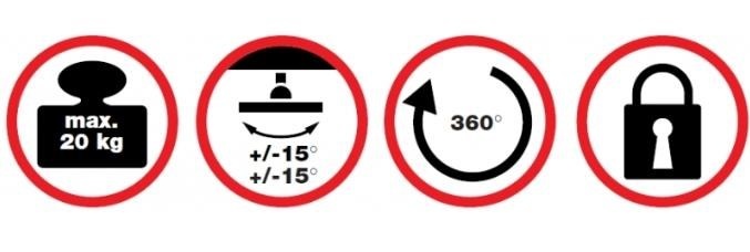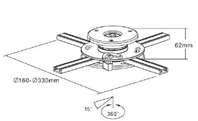 Stropný držiak na dataprojektory - vzdialenosť od stropu 6,2cm, prístroj je možné otočiť o 360° a nakloniť +/-15°, maximálne zaťaženie 20kg, možnosť uzamknutia proti odcudzeniu, čierny / strieborný. Univerzálny systém uchytenia dataprojektorov (rozsah 16-33 cm).