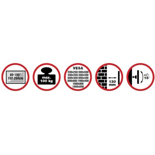 Nástěnný ocelový držák na Plasma a LCD TV s uhlopříčkou 60"-100" (152-254cm) a hmotností maximálně 100kg. Konzole na zavěšení TV s vodováhou, vertikálně výklopný +15°/-15°, vzdálenost od stěny 130mm, materiál ocel, Click-in system, barva černá. Uchycení VESA: 200x200, 400x200, 300x300, 400x400, 600x400, 1000x400, 1000x600, 1000x800..