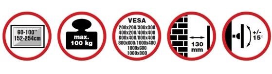 Nástěnný ocelový držák na Plasma a LCD TV s uhlopříčkou 60"-100" (152-254cm) a hmotností maximálně 100kg. Konzole na zavěšení TV s vodováhou, vertikálně výklopný +15°/-15°, vzdálenost od stěny 130mm, materiál ocel, Click-in system, barva černá. Uchycení VESA: 200x200, 400x200, 300x300, 400x400, 600x400, 1000x400, 1000x600, 1000x800..