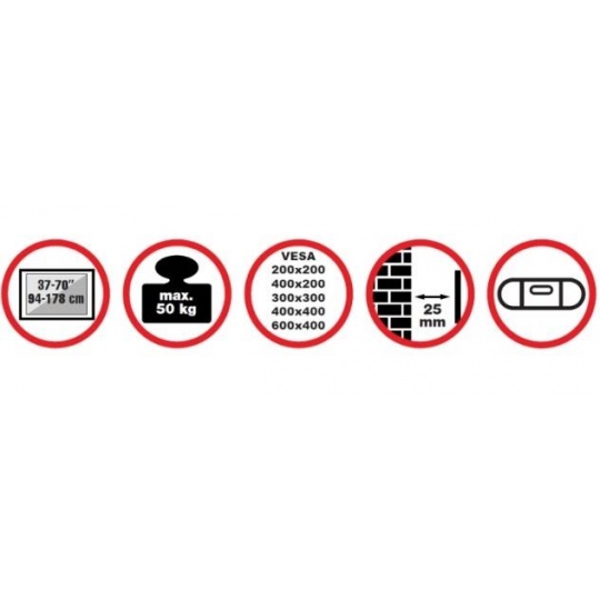 Nástěnný ocelový držák na Plasma a LCD TV s uhlopříčkou 37"- 70" (94-178cm) a hmotností maximálně 50kg. Konzole na zavěšení TV s vodováhou, není vertikálně výklopný, vzdálenost od stěny 25mm, materiál ocel, cenově výhodné, barva černá. Uchycení VESA: 200x200, 400x200, 300x300, 400x400, 600x400..