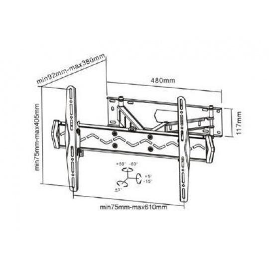 Nástěnný ocelový držák s bočním natáčením na Plazma a LCD TV s uhlopříčkou 37"- 70" (94-178cm) a hmotností maximálně 50kg. Uchycení VESA: 200x200, 400x200, 300x300, 400x400, 600x400. Popis: 3x pant, vertikálně výklopný +10°/-20° a horizontálně otočný +90°/-90°, vzdálenost od stěny 62-475mm, vodováha, materiál ocel, barva černá..