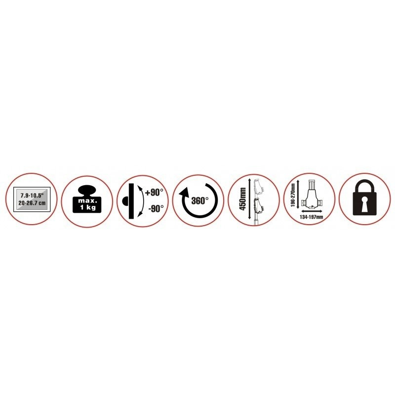 Stojan pro tablety 7-10,5"/20-26,7cm max 1kg na podlahu, plynule nastavitelná výška 63 - 108cm, sklon v rozmezí +90 až -90°, otočný 360° pro rychlou změnu horizontální i vertikální polohy, fixace tabletu ze čtyřech stran, rozměry 442 x 346 x 722 mm, hliníková konstrukce, barva stříbrná/černá..