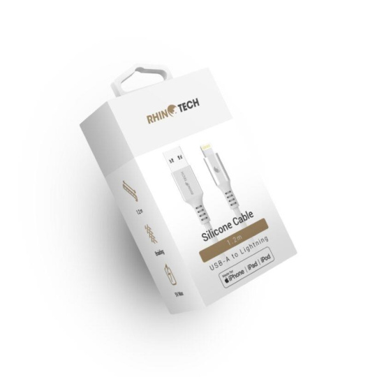 Kvalitní RhinoTech datový a nabíjecí MFi kabel z odolného nylonového materiálu s konektory USB-A na Lightning o délce 1,2m v elegantní stříbrné barvě.
