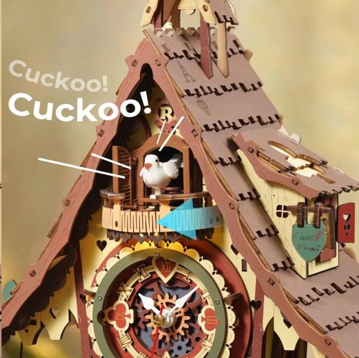 Kačacie hodiny ako z rozprávky! Ukazujú presný čas, očaria Vás hravými detailmi a prinášajú krásu tradičného remesla. Predstavujú lesnú chatku ukrytú v čarovnom lese, doplnenú točícim sa vodným kolom, dreveným plotom a záhradkou. Hodiny majú kukačku, kyvadlo vo tvare polmesiaca, doškovú strechu a mnoho ďalších prvkov. Medzi hravé detaily patria symboly kartových motívov na streche aj ciferníku. Skrytý prepínač ako súčasť schodiska umožňuje spustiť zvuk kukačky alebo nastaviť hodinový zvukový režim. Po zapnutí hodinového režimu vykukne každú celú hodinu veselá kukačka z okienka, roztiahne krídla a zazpiewa jemnú melódiu. Zvuk kukačky a hodinový mechanizmus sú elektronicky prepojené. Skladačka využíva kvartzový strojček riadený kremíkovým kryštálom, ktorý zabezpečuje vysokú presnosť. Časový signál z hodinového strojčeka je spoľahlivo prenesený do mechanizmu kukačky. Teplé tóny osvetlenia prežiaria každý kút a vytvoria čarovnú rozprávkovú atmosféru.