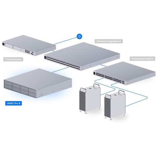 Popis produktu Síťové úložiště UniFi velikosti 2U pro montáž do racku s (8) pozicemi pro 2,5/3,5" pevné disky, (2) sloty pro M.2 NVMe SSD cache, (1) 10 GbE RJ-45 portem a (2) 10G SFP+ porty pro uplink. Poháněn je čtyřjádrovým procesorem ARM Cortex-A57, který je doplněný o 16 GB operační paměti. Disponuje dvěmi redundantními napájecími moduly s možností výměny za provozu.  Obsah balení • Zařízení • Napájecí kabel a zdroj • Příslušenství pro montáž do racku  Technické parametry Konektory a rozhraní Počet slotů pro HDD:8 Počet M.2 slotů:2 Rychlost LAN:(1) 100M/1G/2.5G/5G/10G Gigabit LAN:Ano Optické rozhraní:(2) 10Gbps Ostatní:Bluetooth Napájení Typ napájení:Ze sítě (230V) Redundantní napájení:Ano Max. spotřeba energie [W]:250 Napájení přes konektor/svorkovnici:230V AC Fyzické charakteristiky Provedení:Rackmount Materiál:Ocel Počet "U" pozic:2 LED indikace:Ano Provozní teplota [°C]:-5 až 40 Hmotnost [kg]:11,5 Šířka [mm]:442 Výška [mm]:87 Hloubka [mm]:480 Hardware Velikost operační paměti [GB]:16 CPU:ARM Cortex-A57.