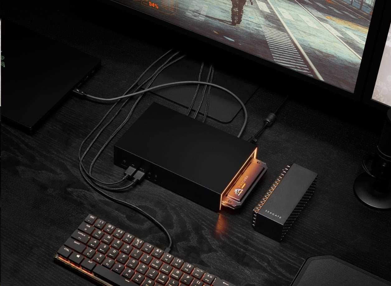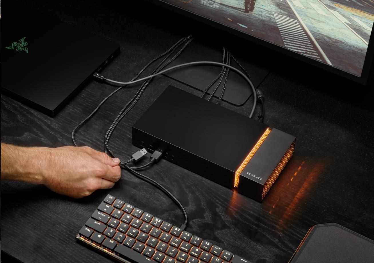 Hrajte tvrdšie s Seagate® FireCuda® Gaming Dock, elitným 4TB úložným hubom, ktorý spája celú stolnú hernú stanicu – klávesnicu, myš, USB slúchadlá, webkameru, monitor displeja a ďalšie – prostredníctvom jedného kábla Thunderbolt 3. Zapojte ho do notebooku a použite rozšíriteľný slot M.2 NVMe na prácu s upgradem FireCuda 510 NVMe SSD pre rýchle spúšťanie aplikácií a načítanie doby. Je dokonca vybavený prispôsobiteľnými RGB LED svetlami pre rovnomerné osvetlenie.