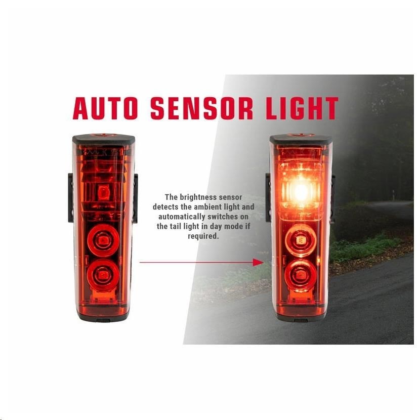 Senzor jasu detekuje okolité intenzity svetla a podľa potreby automaticky zapína a vypína zadné svetlo. Šetrí tak batériu a je ideálne pre situácie, ako sú prejazdy tunelmi alebo jazda na tmavých lesných cestách.