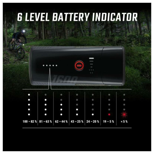 6 svetelných režimov: High (1600 lm), Mid (1100 lm), Low (500 lm), Eco (150 lm), Night Flashing (800/400 lm), Day Flashing (200 lm)