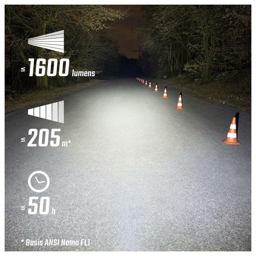 6 svetelných režimov: High (1600 lm), Mid (1100 lm), Low (500 lm), Eco (150 lm), Night Flashing (800/400 lm), Day Flashing (200 lm)