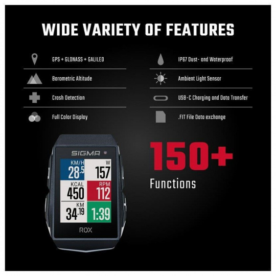 Nezáleží na tom, či sú pre vás dôležité super výkony alebo len udržiavať fyzičku či zdieľať svoje aktivity s priateľmi a rodinou. ROX 11.1 EVO s viac ako 150 funkciami sa stáva používateľovi tréningovým parťákom pre tréningy vonku aj na trenažéri. Okrem početných tréningových funkcií ponúka aj navigáciu, štruktúrované workouty a pripojenie k externým senzorom. Môžete sa tak stopercentne sústrediť len na svoj výkon, zvyšok zabezpečí ROX 11.1 EVO. Vďaka funkcii LIVE SCREEN môžete svoje dáta kedykoľvek sledovať a analyzovať pomocou aplikácie SIGMA RIDE. S navigáciou GPS a mnohými ďalšími funkciami posunie váš tréning na najvyššiu možnú úroveň. Prvotriedna integrovaná funkcia pre vašu bezpečnosť CRASH ALERT odošle správu vašim núdzovým kontaktom v prípade pádu. Chytré oznámenia Smart Notifications počas jazdy informujú o prichádzajúcich hovoroch a SMS.
