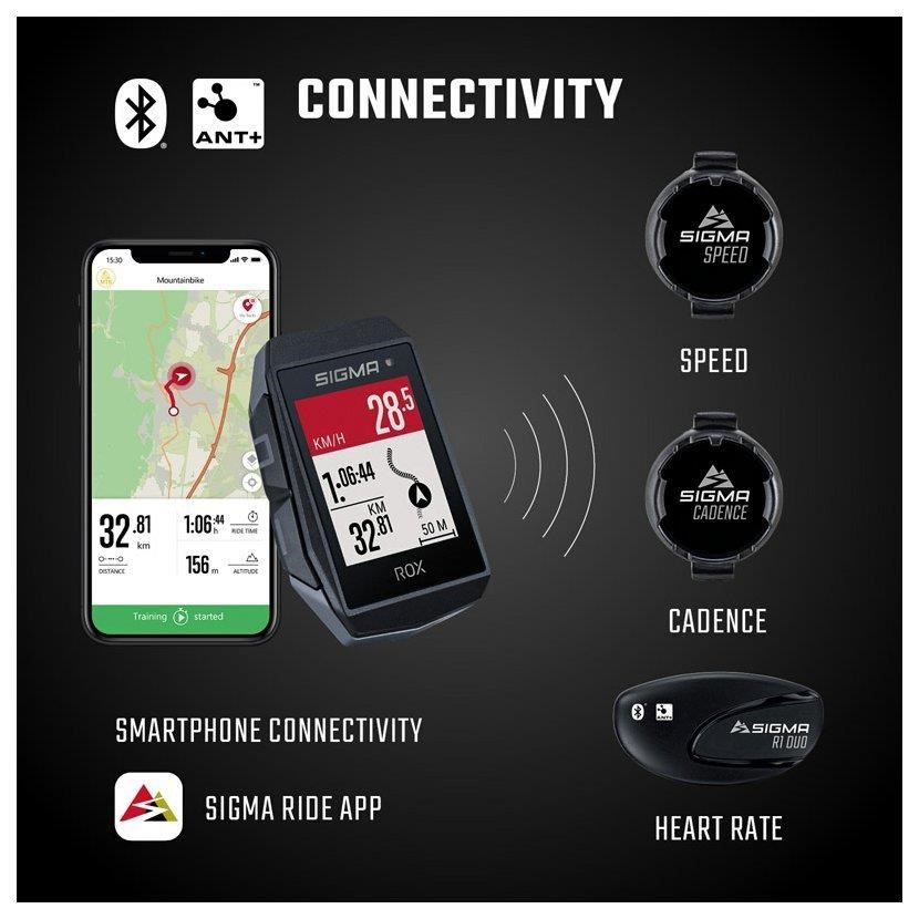Pomocou technológií BLUETOOTH a ANT+ je možné jednoducho a spoľahlivo pripojiť senzory na meranie rýchlosti, frekvencie šliapania a tepovej frekvencie.
