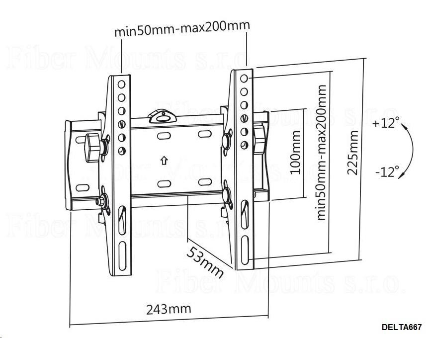 Sklopný držák Tv Fiber Mounts DELTA667 Kvalitní naklopitelný držák na televizory s úhlopříčkou 23" až 42" Televizní držák s náklonem velmi pevné a odolné konstrukce. Snadné naklonění obrazovky do požadovaného úhlu a zajištění v pozici. Pojistka proti vysazení obrazovky z držáku. Výborná kvalita za skvělou cenu. Tv držák sklopný, odsazení 53mm, náklon +12° až -12°, VESA standard 75x75 až 200x200, nosnost 30kg - Fiber Mounts DELTA667 Technické údaje: nosnost 30kg podpora VESA standardu 75x75 až 200x200 doporučujeme na televizory a monitory s úhlopříčkou 23" až 42" vzdálenost od zdi 53mm náklon +12° až -12° zajištění náklonu v požadovaném úhlu pojistka proti vysazení Tv velmi pevná a odolná konstrukce integrovaná vodováha snadná a rychlá montáž součástí balení montážní materiál barva černá záruka 5 let Držák DELTA667 podporuje VESA standardy: VESA 50x50 VESA 75x75 VESA 100x100 VESA 200x100 a 100x200 VESA 200x200.