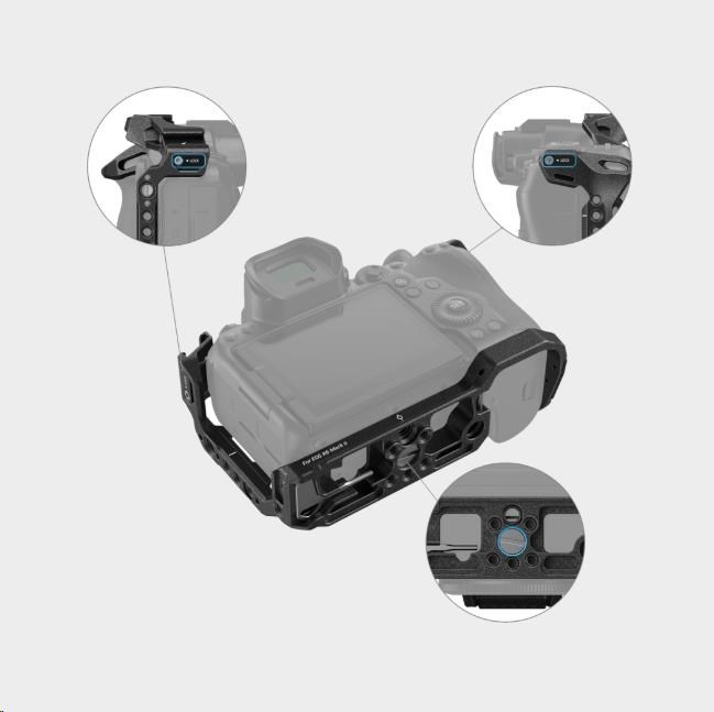 Umiestňuje sa na Canon EOS R6 Mark II pomocou jedného spodného skrutky 1/4"-20 a dvoch bočných zabezpečovacích adaptéri a má gumové podložky, ktoré zabraňujú poškrabaniu.