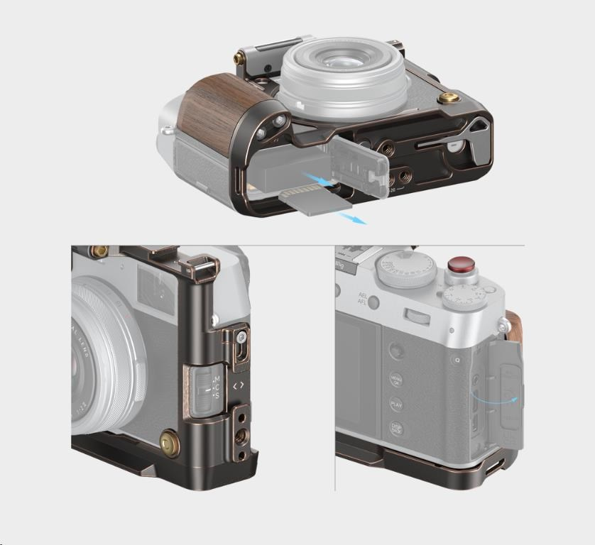Klietka v retro štýle sa k fotoaparátu pripája pomocou skrutky 1/4"-20 na spodnej strane a jedného bočného zámku na ľavej strane a silikónové podložky zabraňujú poškriabaniu.