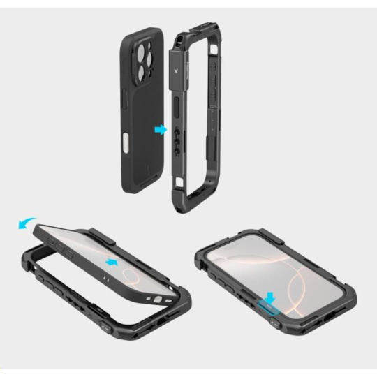 Telefon lze rychle upevnit do klece, která je vybavena několika otvory s 1/4"-20 závitem proti otočení a úchyty pro studenou patku, a rozšířit ji tak o příslušenství, jako jsou rukojeti, stativy, mikrofony a světla, což zvyšuje zážitek z fotografování, zatímco integrované rychloupínací rozhraní zajišťuje bezproblémové připojení.