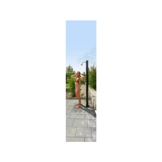 Solárna sprcha je ideálnym zdrojom teplej vody bez použitia elektriny. Voda je v solárnom zásobníku jednoducho ohrievaná slnkom až na 60°C. K tomu prispieva aj čierne prevedenie sprchy. Sprcha je vybavená miešacou pákovou batériou, aby ste si nastavili teplotu vody, ktorá vám bude vyhovovať.