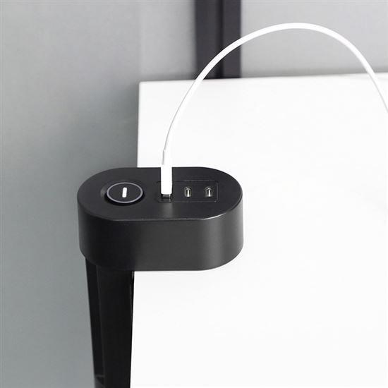 zásuvky 230V schované pod stolom, USB nabíjačka a centrálny vypínač prístupné shora