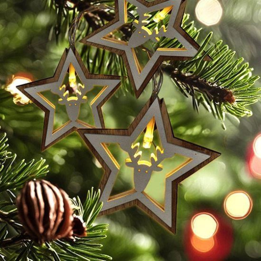 Solight LED vánoční řetěz hvězdy, 10x LED, dřevo, 1,5m, 2x AA