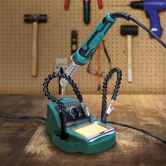 Kompaktná spájkovačka s 360° otočnými krokosvorkami, ideálna pre prácu s rôznymi veľkosťami súčiastok a dosiek. Silikónový kábel je mäkší a tepelný odolný pre pohodlné používanie. Výkon 48 W s teplotným rozmedzím 160–480 °C a keramickým topným telieskom pre rýchle a stabilné zahrievanie. Príslušenstvo zahŕňa stojan na spájkovacie pero a držiak hubky pre čistenie hrotu. Napájanie 230V, 50Hz.