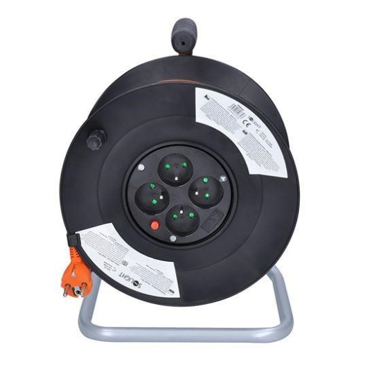PVC kábel s vodičmi o priečinku 3×1,5 mm2 je vhodný pre vnútorné a suché chránené priestory. Bubon je vybavený štyrmi zásuvkami s detskými poistkami, navyše aj tepelnou poistkou, ktorá preruší napájanie v prípade preťaženia alebo pri použití bez úplného odvinutia kábla. Farebné odlíšenie kábla od okolitého prostredia zvyšuje bezpečnosť pri práci.
