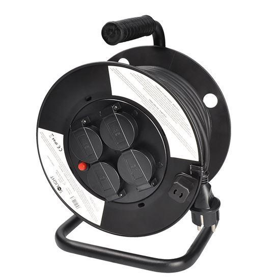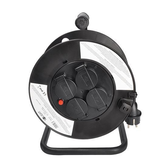 25m gumový kábel na bubne z odolného plastu a štyrmi zásuvkami je ideálny na použitie vonku, na záhradách, stavbách alebo v dielňach. Pevná konštrukcia s krytými zásuvkami aj samotný kábel sú odolné voči poveternostným podmienkam a mechanickému namáhaniu.
