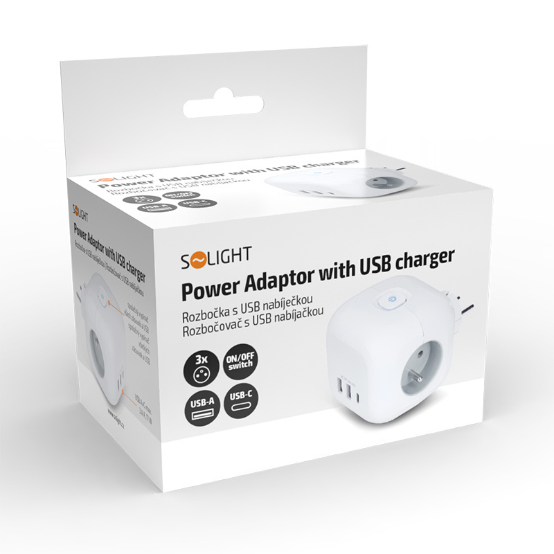 Solight rozbočka kostka, 3x 16A + USB A+C, bílá, vypínač