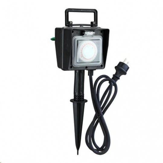 plastový stĺpik s elektrickými zásuvkami a časovým spínačom prenosný prívod elektrickej energie do záhrad a sadov 2 zásuvky s krytkami proti vlhkosti a prachu časový spínač mechanický 24h, min. časový úsek 15min hrot na zapichnutie do zeme gumený kábel 3x 1,5mm2, typ H05RR-F3 dĺžka: 1,5m farba: čierna, zelené kryty zásuviek trieda ochrany: IP44